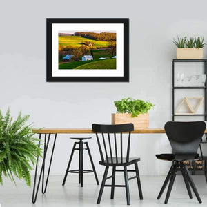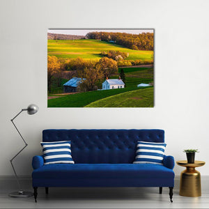 Capture the essence of rural life with this serene landscape featuring a farmhouse and barn set against rolling hills and lush trees. The late afternoon sun casts soft shadows, enhancing the peaceful atmosphere, making it a perfect addition to any space that embraces nature's beauty.