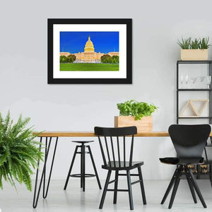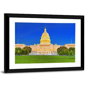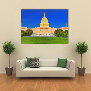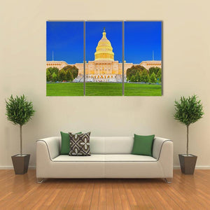 A realistic canvas print of the United States Capitol Building that conveys a majestic, grand, and patriotic atmosphere. The symmetrical composition highlights the domed building, grass lawn, and trees beneath a blue sky in a gold, green, and blue palette—suited to modern home or office room decor.