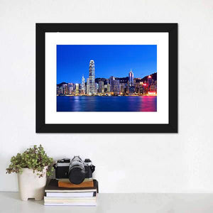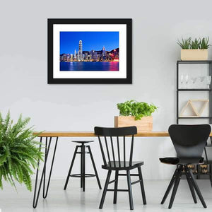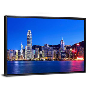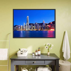 A vibrant nighttime cityscape of Hong Kong’s skyline and waterfront, with illuminated skyscrapers reflecting on the water. Rendered in blues, whites and yellow accents, this modern canvas print suits contemporary and urban-themed rooms.