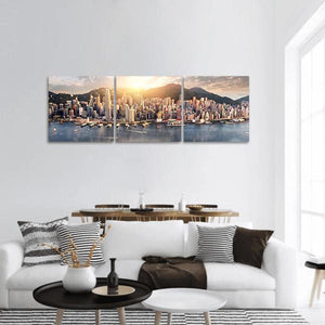 This Hong Kong city skyline panoramic canvas captures the harbor, mountains and rows of skyscrapers in a photorealistic, modern style. Bathed in blue, gold, grey and white tones at sunrise or sunset, the wide-angle scene feels optimistic and vibrant and suits modern living rooms or offices.