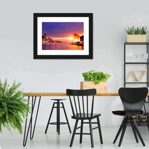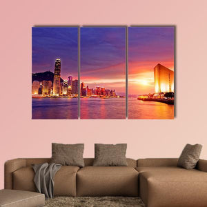 A modern, realistic depiction of Hong Kong’s waterfront skyline at sunset, showing tall skyscrapers and glowing lights along the water. Purple, orange, and blue tones create a vibrant yet peaceful mood that works well in contemporary living rooms and offices.
