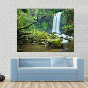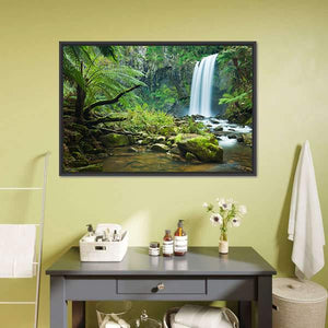Experience the tranquil beauty of Hopetoun Falls with this serene canvas wall art. Featuring a vibrant palette of greens, blues, and browns, the artwork captures the motion of cascading water amidst lush greenery and rocky terrain, creating a peaceful atmosphere for any space.