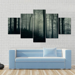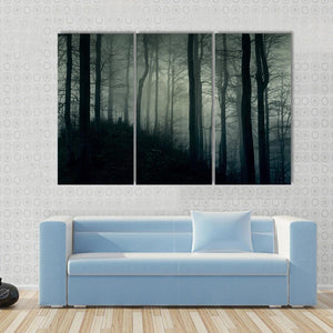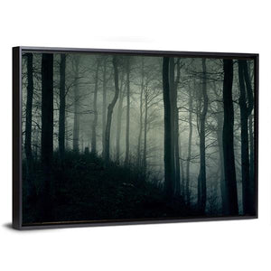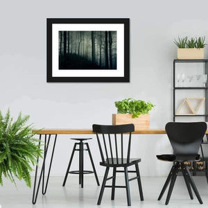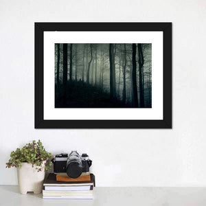 This captivating canvas showcases a misty jungle filled with silhouetted trees and dark undergrowth, creating an eerie and mysterious atmosphere. Its tranquil palette of dark greens, grays, and blacks enhances the dramatic landscape, making it an intriguing addition to your wall decor.