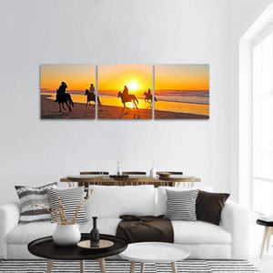 A panoramic photographic print of horses and riders on a beach at sunset, with silhouettes set against warm orange and yellow light and cool blue ocean tones. The scene feels serene and calm, capturing a golden-hour coastal mood. Suited to modern room decor—try it in living rooms or bedrooms for a coastal touch.