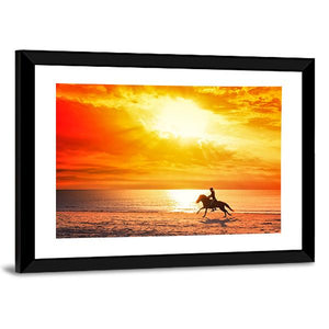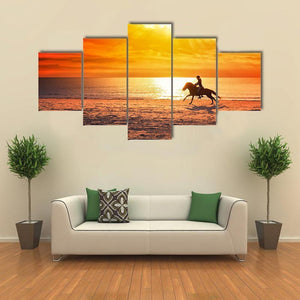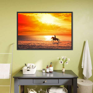 A silhouette of a horse and rider crosses a beach at sunset, rendered in warm orange and yellow tones with hints of brown and blue. The modern, rule-of-thirds composition feels serene and dynamic and works well in modern living rooms or entryways.