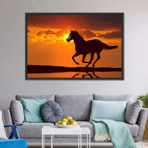 This captivating canvas features a powerful silhouette of a horse running against a striking sunset, reflected beautifully in calm water. The dramatic palette of orange, yellow, and black adds a serene yet dynamic feel, making it a bold statement piece for your wall.