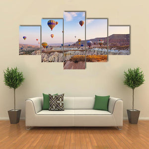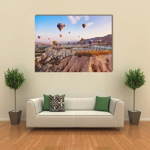This canvas art captures colorful hot air balloons soaring under a blue sky, creating a sense of adventure and serenity. With unique rock formations and warm tones, it brings a scenic touch to any space.