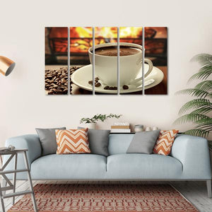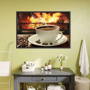 This cozy canvas art features a close-up of a warm coffee cup and coffee beans next to a glowing fireplace. Its inviting palette of browns, whites, and oranges sets a rustic atmosphere perfect for any indoor space.