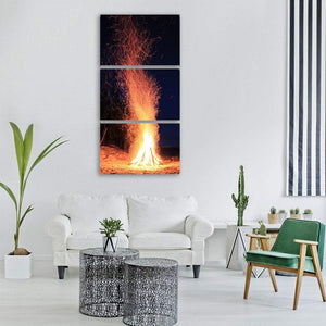 Fire On Winter Beach Canvas shows a bonfire and sparks on a night-time shore. Long-exposure trails of orange and yellow flames cut through deep blues and black, creating a dramatic, energetic and primal mood. Suited to modern or beach-themed rooms as bold wall art.