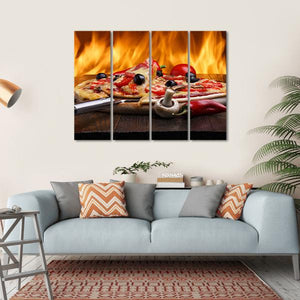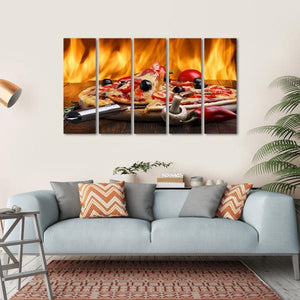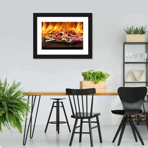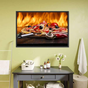 Bring the delicious allure of hot pizza into your space with this vibrant artwork. Featuring a close-up of whole and sliced pizza topped with mushrooms, peppers, tomatoes, and olives, the dramatic flames in the background create an intense atmosphere. This piece is sure to spark appetites and conversation.