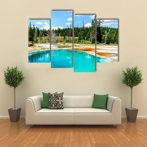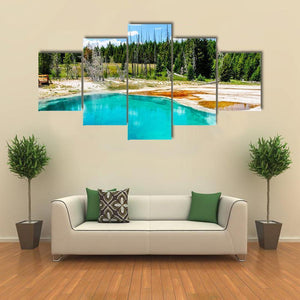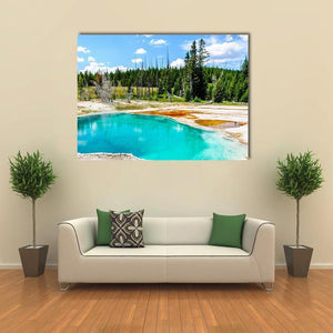 A landscape view of a hot spring in Yellowstone, with vivid turquoise water and dead trees along the pool that draw the eye. Pine forest and a partially cloudy summer sky sit in the background, creating a serene, natural, and vibrant scene that suits living rooms or nature‑inspired bedrooms.