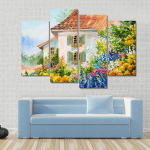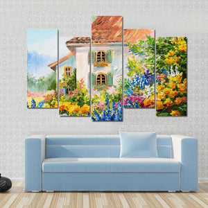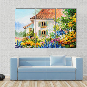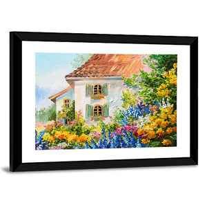 This vibrant landscape features a charming house surrounded by colorful flowers and lush greenery. Its idyllic, cheerful vibe makes it a wonderful addition to any space, bringing a touch of peace and joy.