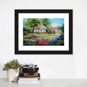 Capture the essence of a peaceful village with this colorful canvas wall art featuring a charming thatch roof house surrounded by vibrant flowers and a serene field. This idyllic scene, painted in impressionistic style, brings warmth and tranquility to any space.