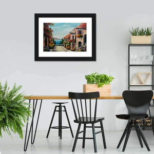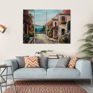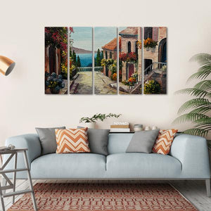 This canvas artwork captures a picturesque Mediterranean street with charming buildings and flowers. The serene sea view adds a sunny, vibrant touch, making it a delightful addition to any wall decor.