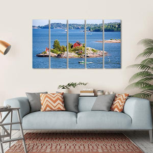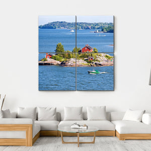 This beautiful landscape depicts a small rocky island in Finland, where charming red buildings contrast against the serene blue waters. The scene captures a peaceful moment, with a green boat gently moving by, surrounded by lush trees and a clear sky.