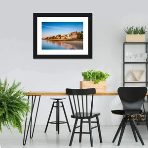 This canvas art features the tranquil beachfront homes of Charleston, capturing serene ocean views and reflections in calm waters. The palette of blue, white, tan, and green evokes a bright and peaceful atmosphere, making it a great fit for any wall decor.