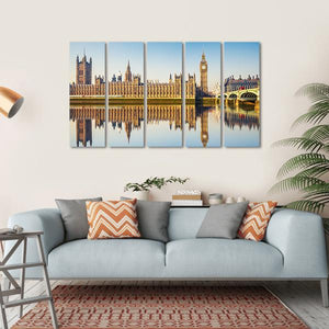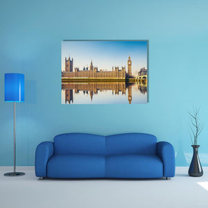 This stunning canvas art captures the iconic Palace of Westminster and Big Ben along the River Thames. The majestic scene, with its serene blue and gold palette, evokes a historic atmosphere enhanced by a clear reflection in the water.