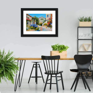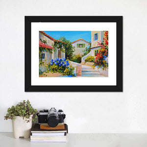 Capture the serene essence of summer with this vibrant canvas featuring charming houses adorned with blue hydrangeas and red flowers. The artwork's impressionistic style highlights lush foliage and white stairs, inviting a tranquil mood into your space.