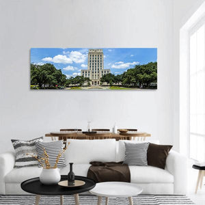Houston City Hall is captured in a panoramic photographic print, showing a tall classical building with columns framed by lush green trees and a blue sky with white clouds, giving the scene a grand architectural presence. The blue, green, white, gray and tan palette and photographic style suit entryways, living rooms, or offices as an architectural focal point.