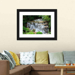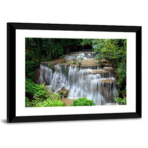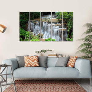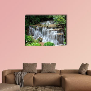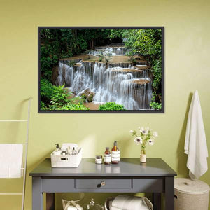 This canvas features a serene tiered waterfall surrounded by lush green foliage and rocks. The natural composition creates a tranquil atmosphere, making it a beautiful addition to any room that embraces nature's beauty.