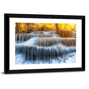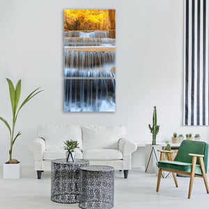 This vertical canvas art brings to life a vibrant waterfall surrounded by trees in Kanchanaburi, Thailand. With its serene blue and warm yellow hues, it evokes a natural tranquility perfect for enhancing any space.