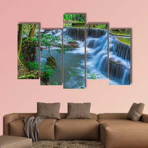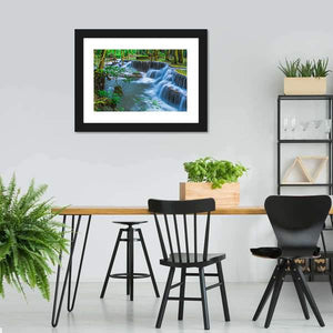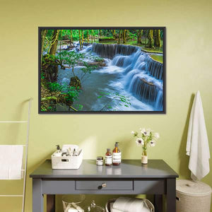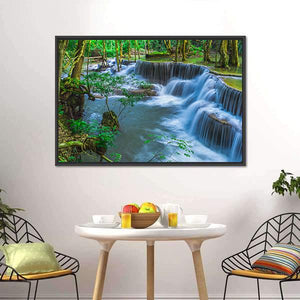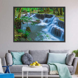 Huay Mae Khamin Waterfall in Thailand shows a multi-tiered waterfall set against lush forest and a flowing river, rendered in a realistic landscape. Soft blues, greens and earth tones create a serene, natural mood that works well in modern or nature-inspired living rooms and bedrooms.