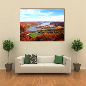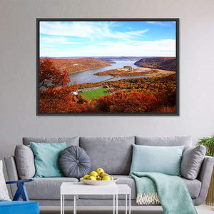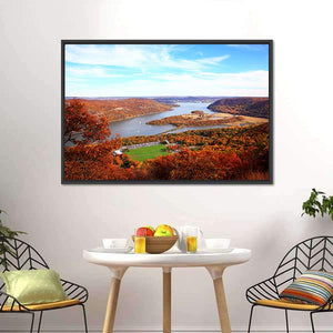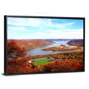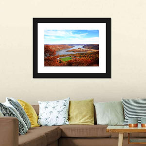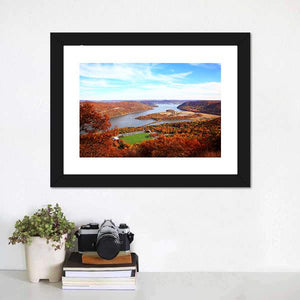 This piece captures a serene landscape along the Hudson River, showcasing a vibrant mix of autumn foliage and a clear blue sky. Perfect for adding a peaceful, natural touch to your home decor.
