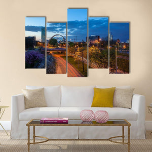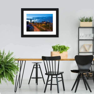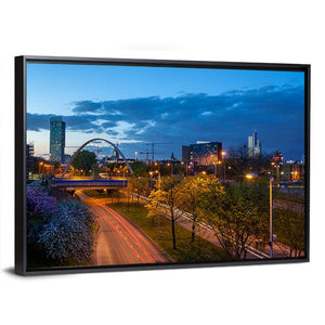 This captivating cityscape features the Hulme Arch Bridge, framed against an energetic twilight backdrop. The vibrant palette of blue, orange, and green pairs beautifully with the illuminated buildings and light trails from passing cars, making it a striking addition to any modern decor.