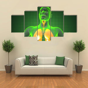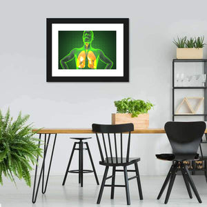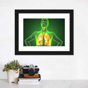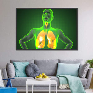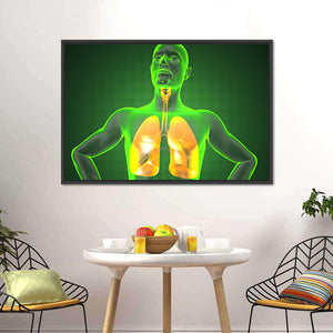 This canvas shows a centered, symmetrical radiographic view of the human chest with a transparent torso, visible trachea, and glowing lungs. Rendered in green, yellow, and orange with a scientific, educational mood, it fits medical offices, classrooms, or modern home studies.