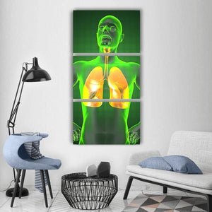 Centered and scientific, this canvas depicts a human chest radiography with a translucent green silhouette, glowing orange lungs, and a visible trachea. The modern medical-illustration style and green, yellow, and orange palette give an informative, vibrant look that suits medical offices, science rooms, or a contemporary study.