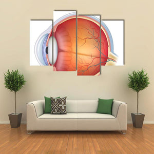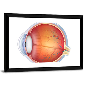 A centered, detailed illustration of a human eye cross-section showing the retina, optic nerve and branching blood vessels. Rendered in reds, oranges, blues, white and green, the piece reads as educational and scientific and works well in medical offices, classrooms, or a modern study where precise, factual art fits the room.