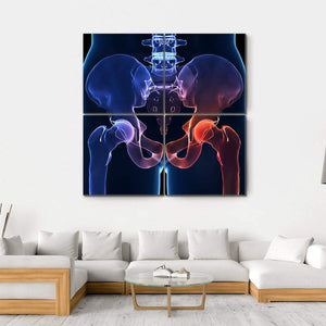 This striking canvas features a glowing anatomical representation of the human pelvis and hips, showcasing a stark contrast between blue and red/orange tones. Its clinical and informative vibe makes it an intriguing piece for any contemporary space.