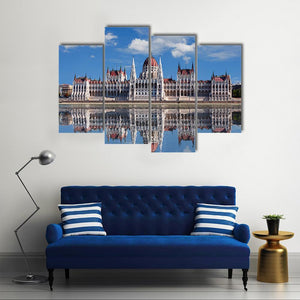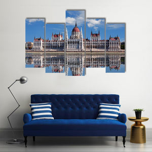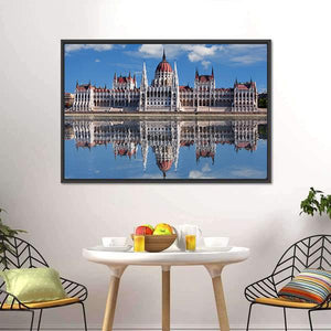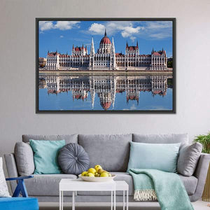This canvas wall art beautifully captures the Hungarian Parliament and its majestic reflection in the Danube River. The ornate architecture, including domed roofs and spires, is framed by a serene sky and clouds, offering a striking view of Budapest.
