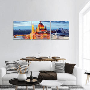 Featuring the Hungary Parliament building with river and bridge, this panoramic canvas captures Gothic architecture, a domed roof, and a twilight sky. Rendered in a realistic style with orange, yellow, blue and gray tones, it creates a majestic, serene, historical mood suited to modern living spaces.