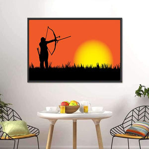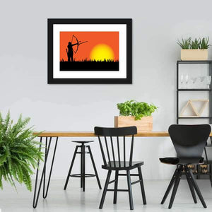 This striking canvas art captures a solitary archer silhouetted against a vibrant sunset. The dramatic shades of orange and yellow contrast beautifully with the deep black grass, evoking a peaceful yet intense atmosphere.