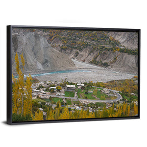 This canvas wall art captures the enchanting Hunza Valley, showcasing a serene village nestled among majestic mountains, a winding river, and rich autumn foliage. Its realistic style and soothing palette of greens, yellows, and blues invite a tranquil atmosphere to your space.