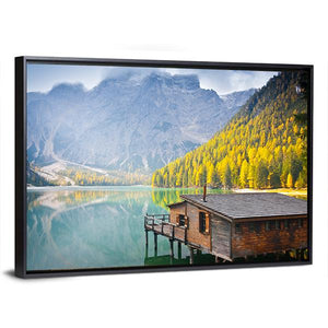 This captivating canvas features a serene lake house surrounded by mountains and autumn foliage. Its natural colors evoke a peaceful atmosphere, making it a wonderful addition to any room in your home.