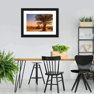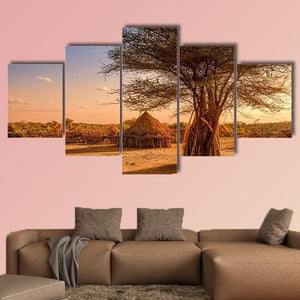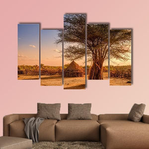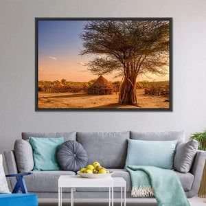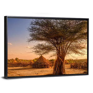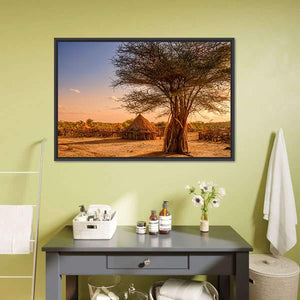 Huts In Hamer Village Canvas Wall Art shows a quiet village scene of thatched-roof huts gathered beneath a gnarled acacia tree, with warm golden, blue and brown tones at sunset. The rule-of-thirds composition creates a serene, peaceful, arid mood that suits rustic, natural interiors.
