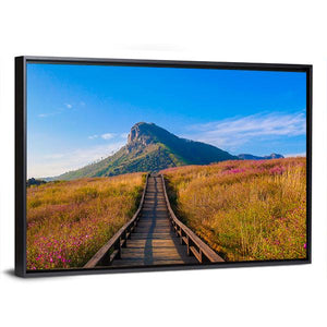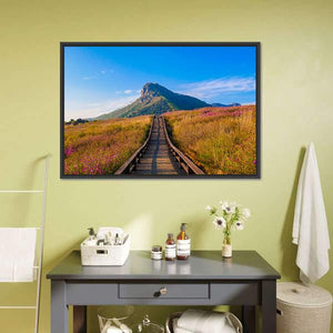 Hwangmaesan Mountain in South Korea rises beyond a wooden boardwalk that stretches through a field of flowers. This realistic nature photograph uses leading lines and a blue-green palette to create a serene, adventurous mood. The print suits modern living rooms, entryways, or any space that favors natural, calm imagery.
