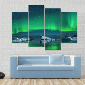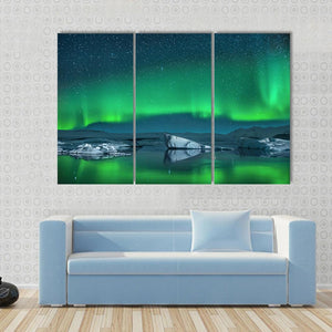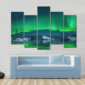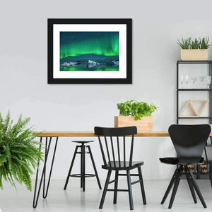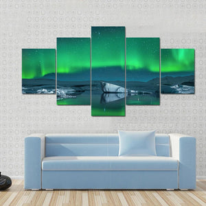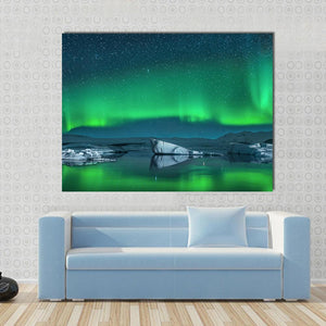 This stunning piece captures the aurora borealis dancing above majestic icebergs, reflecting on the serene water below. Its tranquil palette of greens and blues creates a magical atmosphere, making it a beautiful addition to any wall space.