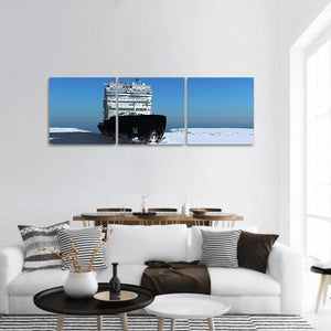 A photorealistic panoramic canvas of an icebreaker ship moving through ice floes and calm open water. Cool blues, whites, greys and black create a cold, vast, isolated mood. Suited to modern or minimalist rooms that favor strong landscape imagery.