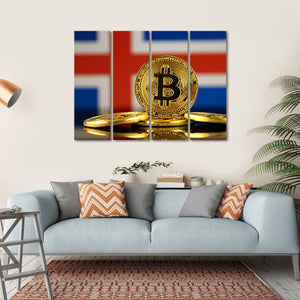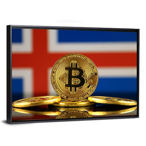 Celebrate Iceland's spirit with this canvas wall art featuring the Icelandic flag alongside stacked bitcoins. The vibrant palette of gold, blue, red, and white evokes a modern, financial vibe, making it a striking piece for any contemporary space.