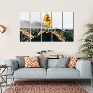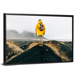 This canvas captures the adventurous spirit of a lone hiker in Iceland, dressed in a bright yellow jacket against a dramatic backdrop of black sand dunes and dry grass. The striking contrast of colors creates a compelling scene that invites exploration and reflection.