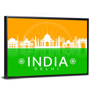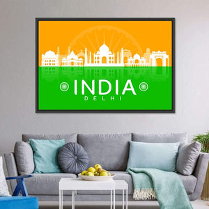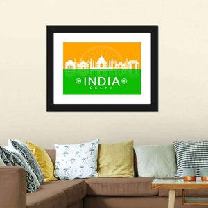 A minimalist, graphic panorama of Indian landmarks in orange, green and white, the illustration shows stylized silhouettes of domes and arches with a wheel-like motif and reflected skyline below. It conveys a vibrant, patriotic, celebratory mood and works well in modern rooms or contemporary hallways.