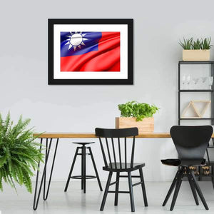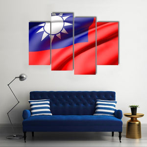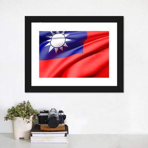 Waving Taiwan Flag Canvas Wall Art presents a close-up of the Taiwanese flag, with diagonal lines and dynamic folds that imply motion and a rippling fabric effect. Bold red, blue, and white tones and a bright sunlight reflection on the sun emblem create a proud, patriotic, modern graphic mood suited to living rooms, home offices, or entryways.
