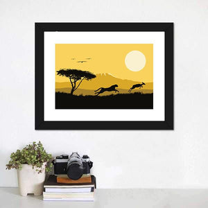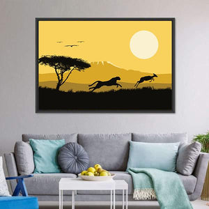 This striking canvas captures the thrilling scene of two cheetahs chasing their prey across a vibrant savannah landscape. With a rich palette of golds and yellows reflecting the warmth of the sun, this artwork brings a sense of wild action to your space.