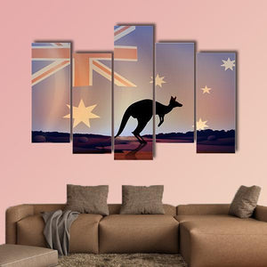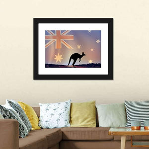 This canvas shows a kangaroo silhouette in the foreground with the Australian flag visible behind it, composed using the rule of thirds. Purple and orange sunset tones give the scene a patriotic, serene, and powerful mood. It suits home wall decor and complements modern, graphic interiors.