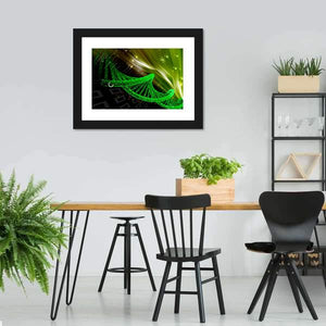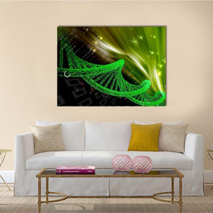 This canvas features a glowing green DNA helix against a black field of square elements, overlaid with binary-like code and streaks of light. Its diagonal, dynamic composition and futuristic palette create a scientific, energetic mood suited to a home office, study, or science-themed room.
