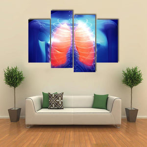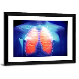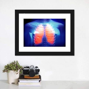 An illustrative canvas showing human lungs with a translucent rib cage, rendered in blue, red and white. The symmetrical, medical-style composition includes a subtle glowing effect on the lungs and carries a scientific, detailed mood that suits a study, clinic, or science-themed room.