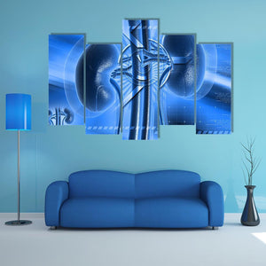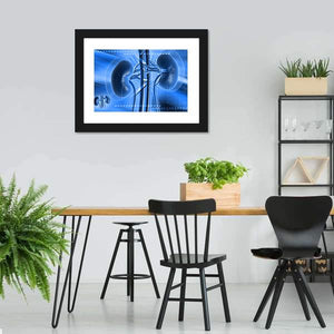 An anatomical illustration of kidneys with a clinical, scientific mood in blue, white, and grey tones. The symmetrical composition highlights the renal artery, renal vein, and ureter in clear, detailed line work, suited to a medical office, study, or modern room decor.